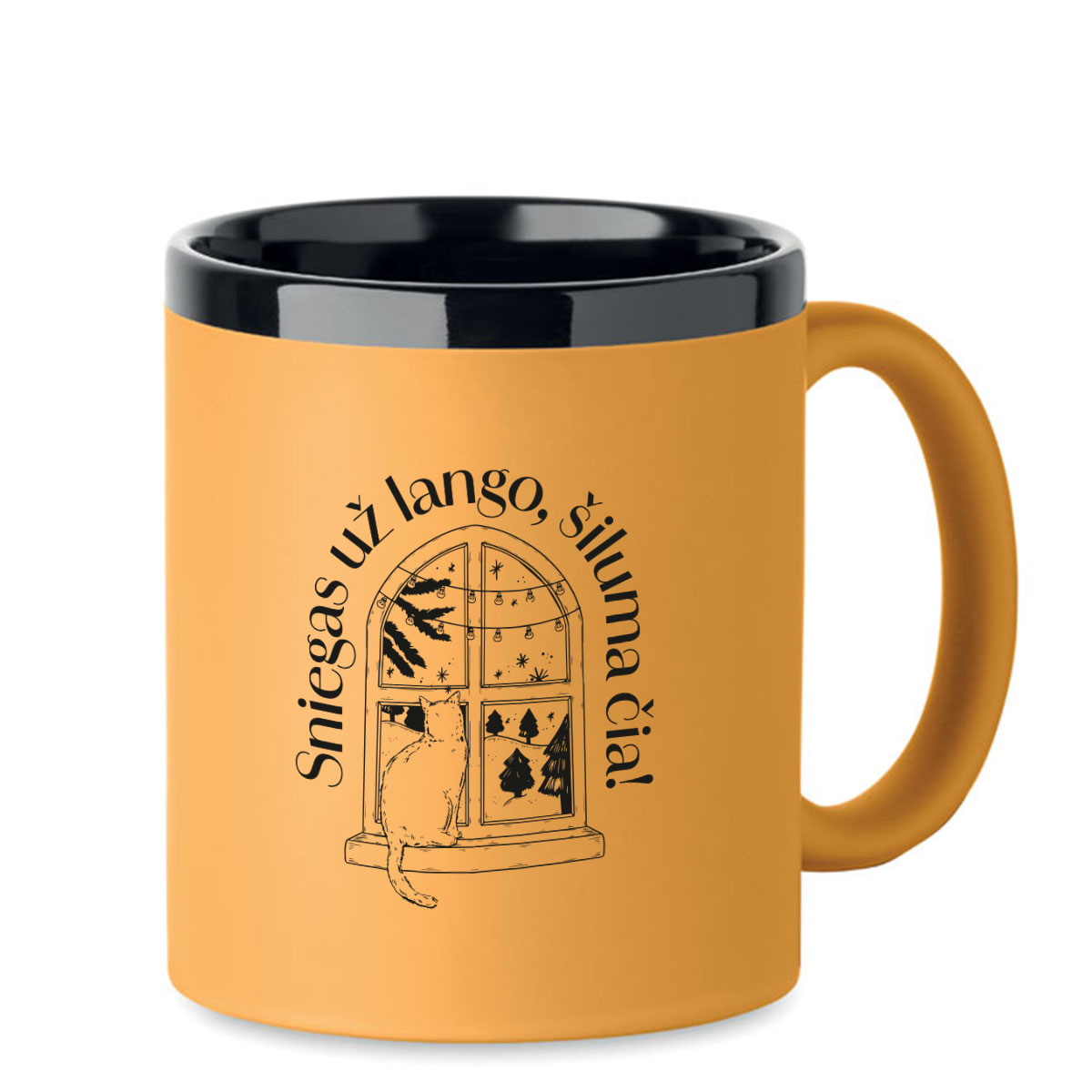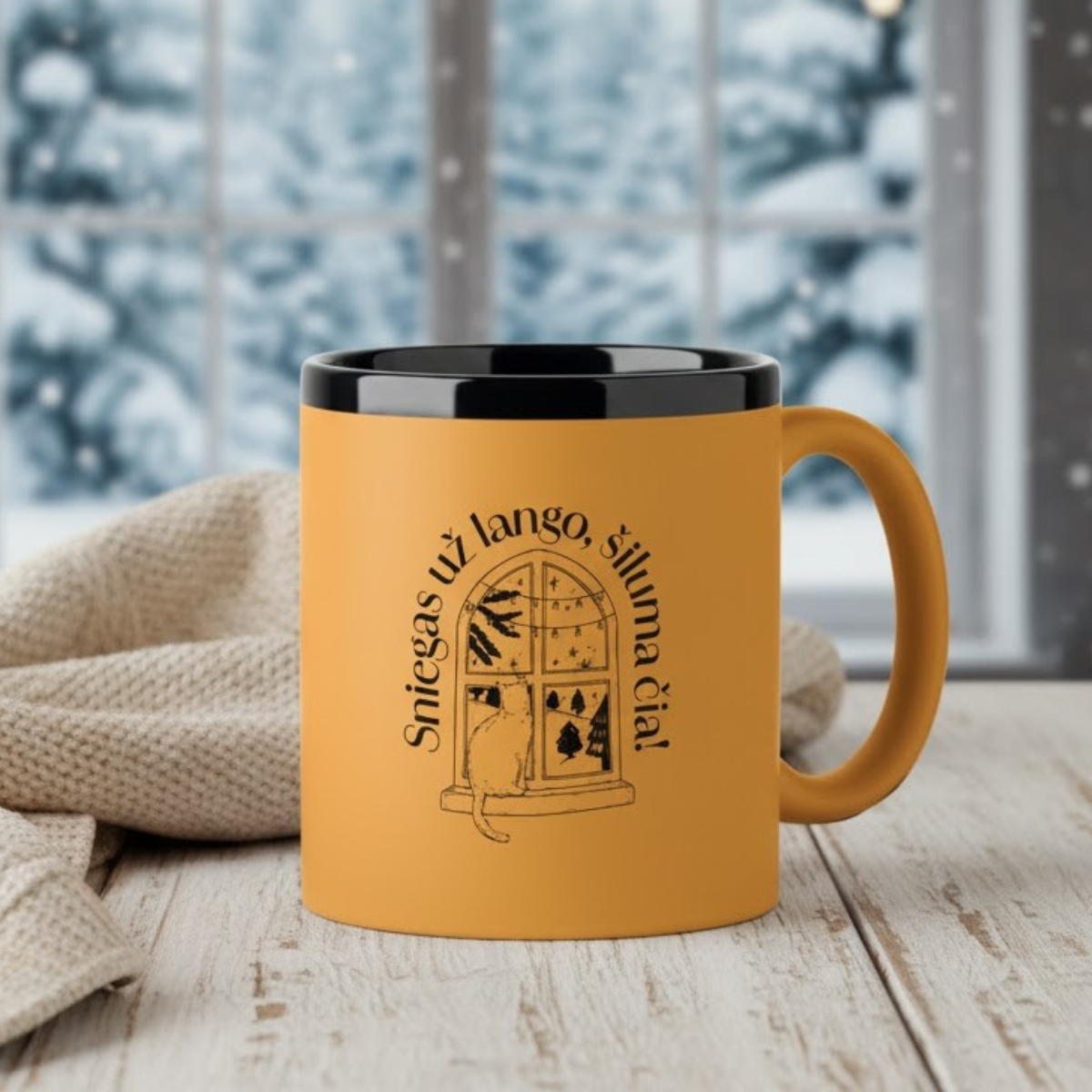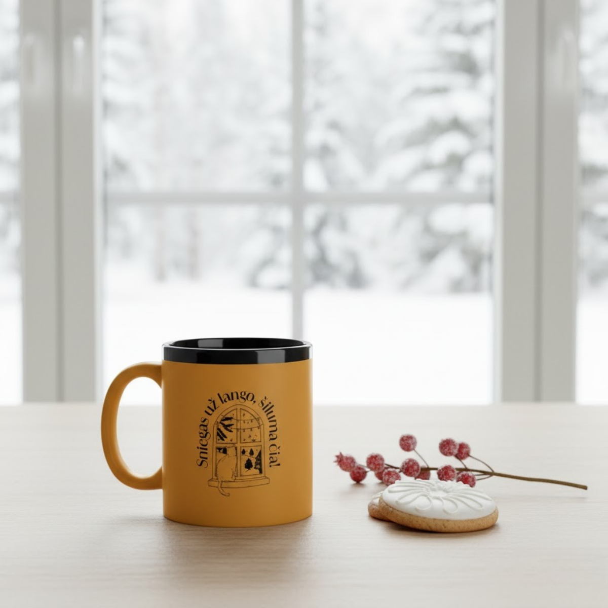 Graviruotas puodelis "Sniegas už lango, šiluma čia"