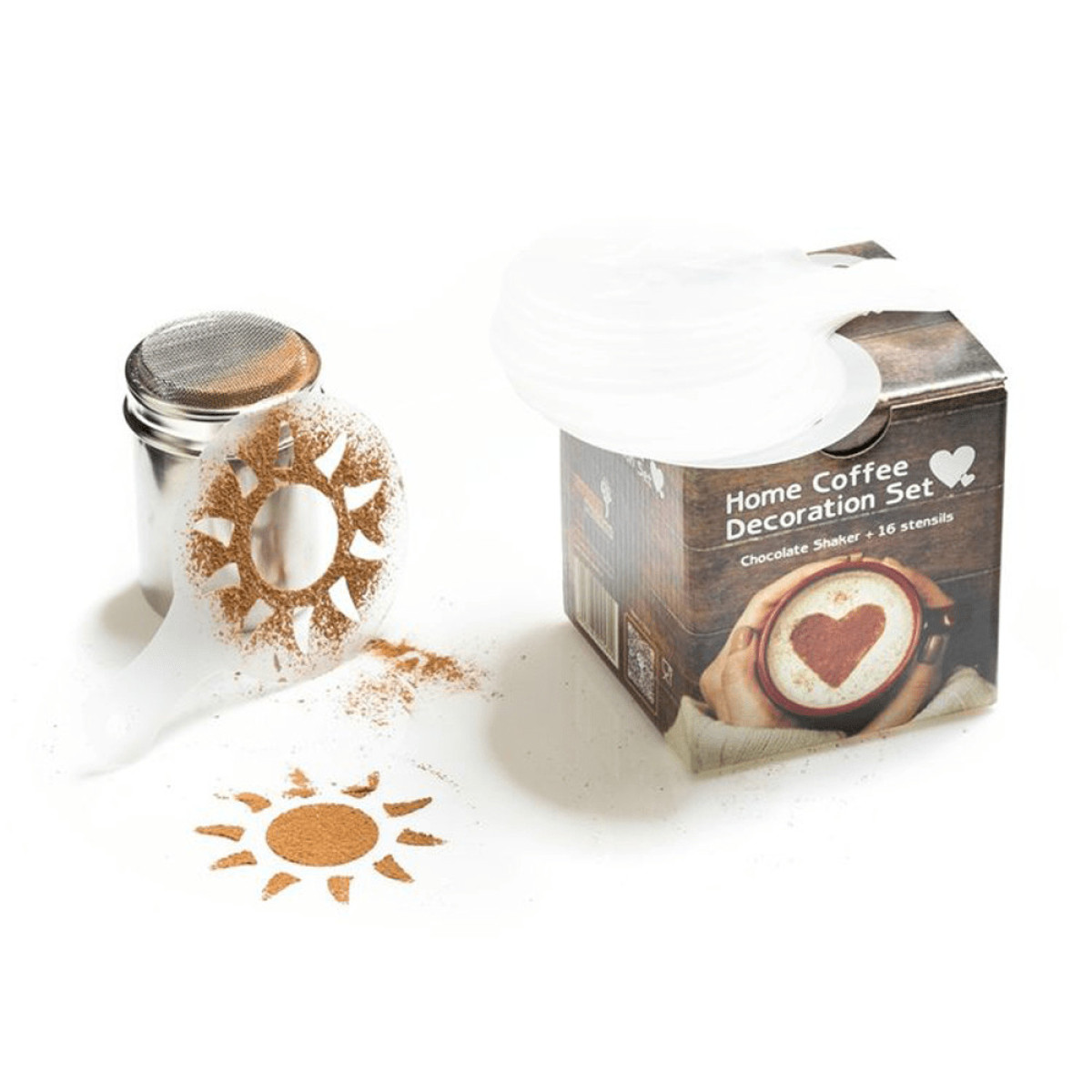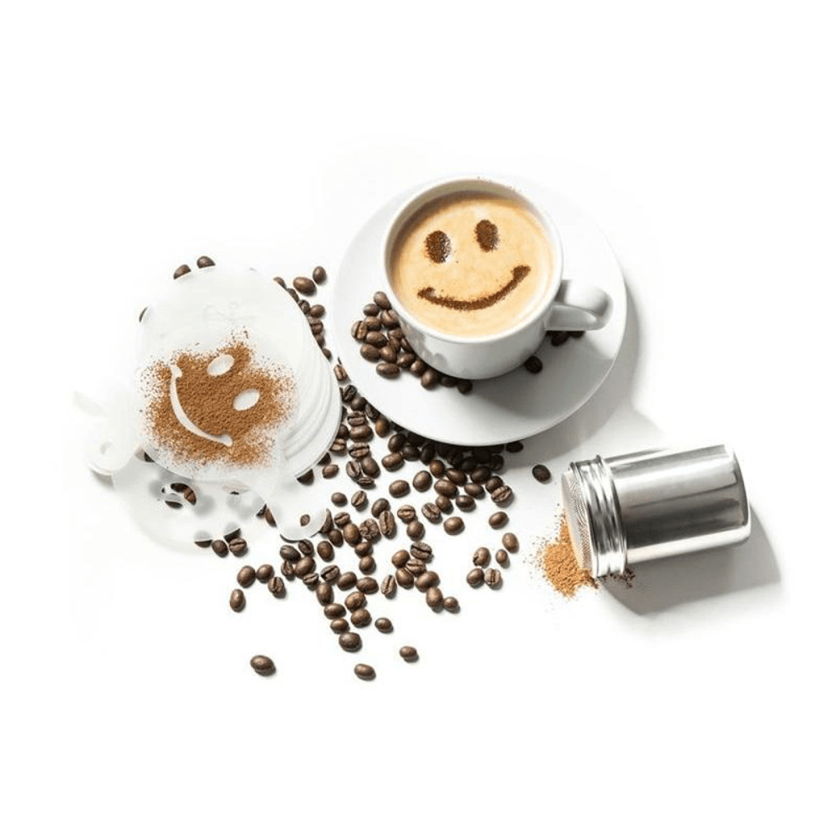 Suteikite kavai nuotaikos! Pasinaudodami šiuo 16 linksmų ir skirtingų trafaretų bei barstyklė galėsite pagrąžinti kavą ar desertą. Ne tik maloniai nustebinsite šeimos narius, bet ir svečius. Šie priedai puikiai tiks ir desertų pušimui.