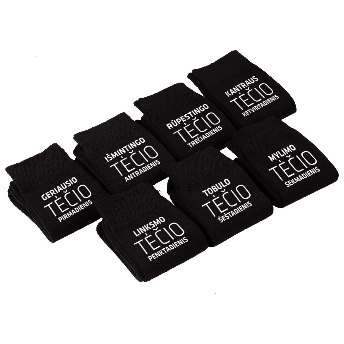 - 7 poros kojinių su spauda ant kiekvienos kojinės (7 skirtingi maketai x 2 vnt.).
