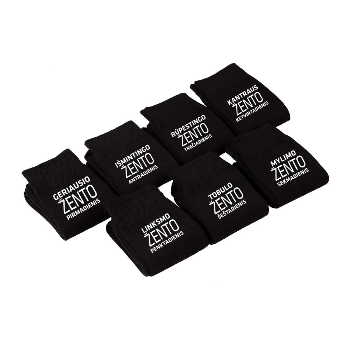 - 7 poros kojinių su spauda ant kiekvienos kojinės (7 skirtingi maketai x 2 vnt.).