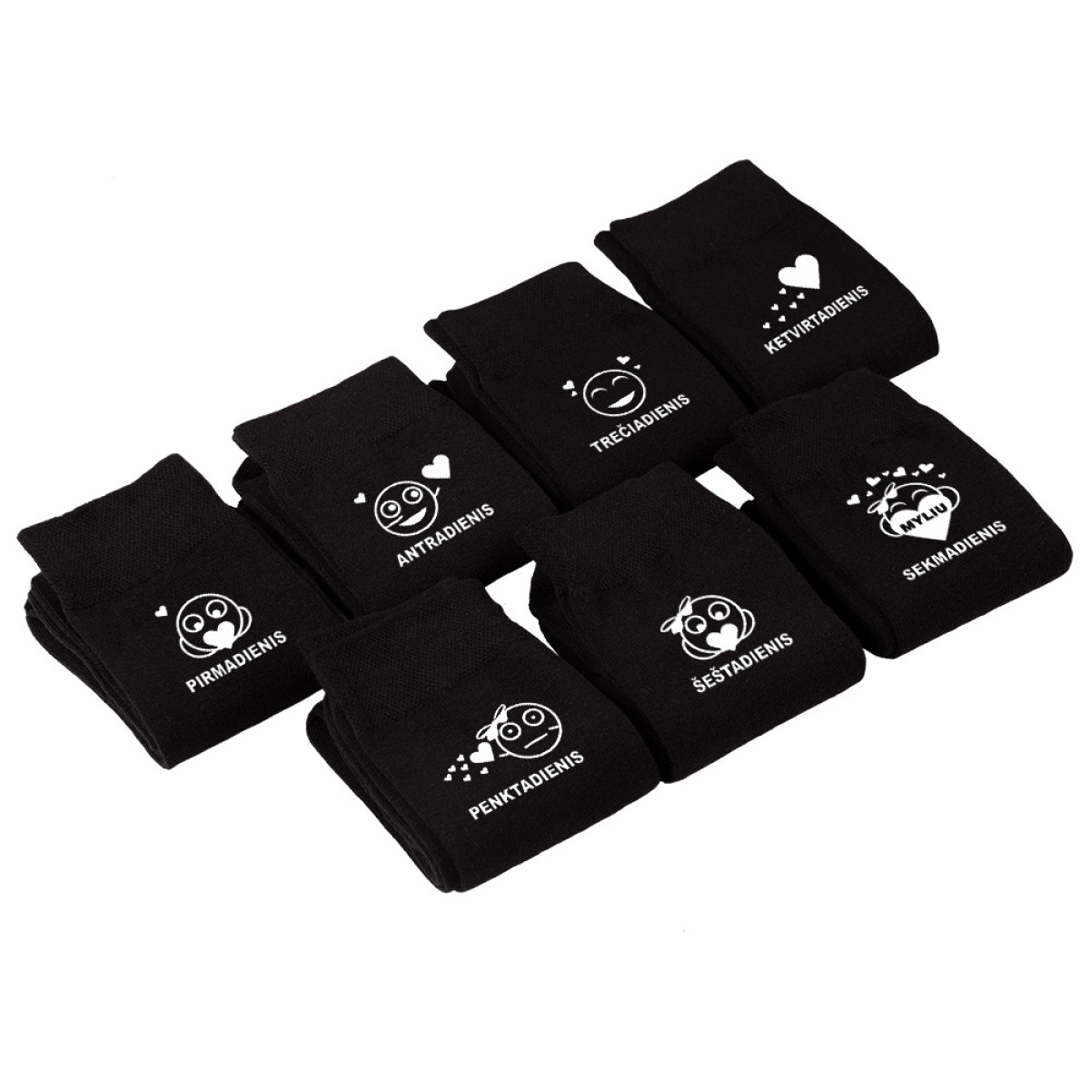 - 7 poros kojinių su spauda ant kiekvienos kojinės (7 skirtingi maketai x 2 vnt.).