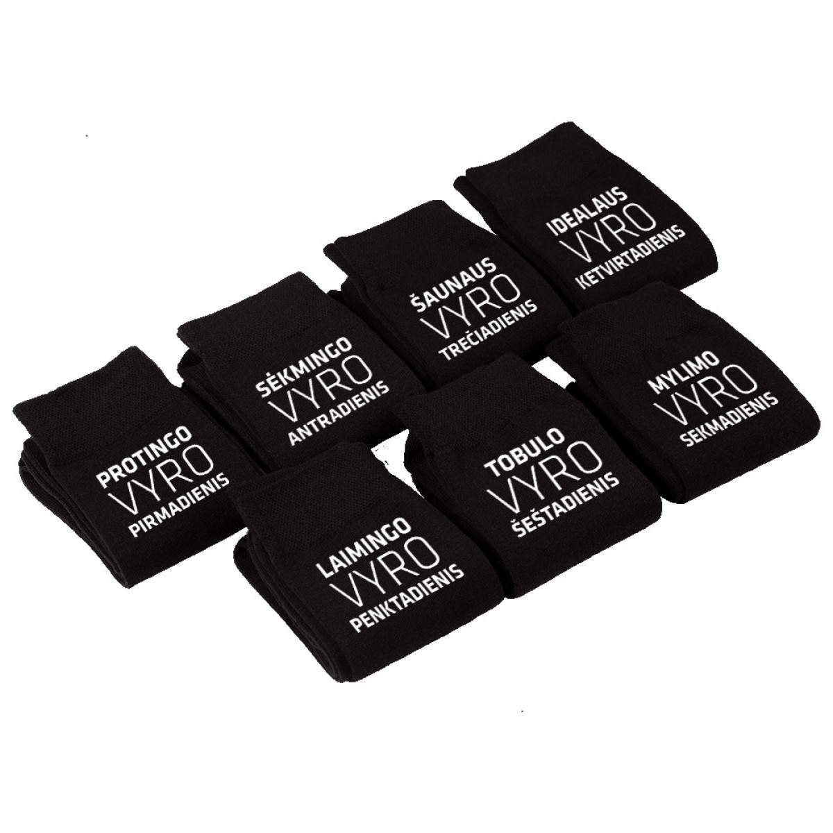- 7 poros kojinių su spauda ant kiekvienos kojinės (7 skirtingi maketai x 2 vnt.).