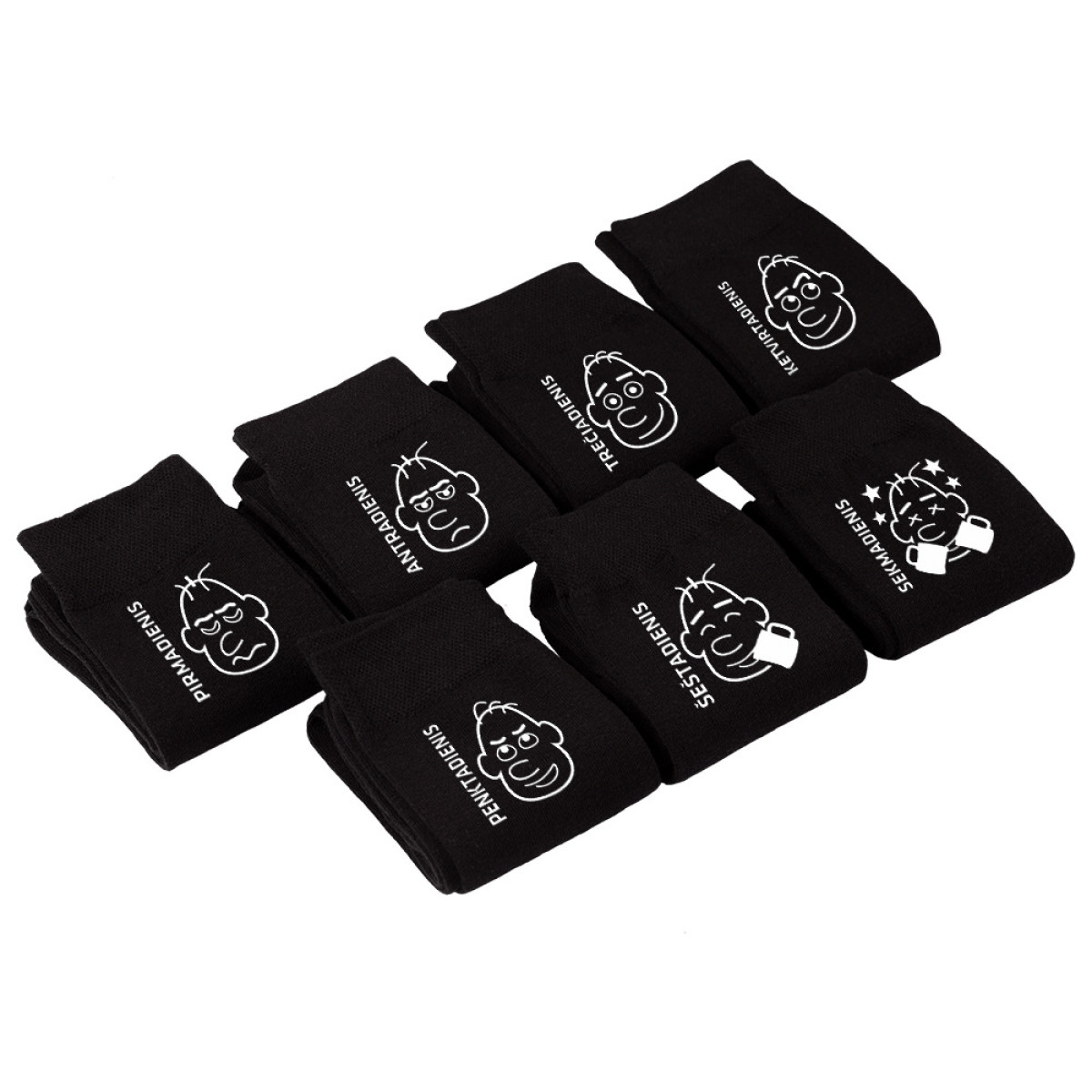 - 7 poros kojinių su spauda ant kiekvienos kojinės (7 skirtingi maketai x 2 vnt.).