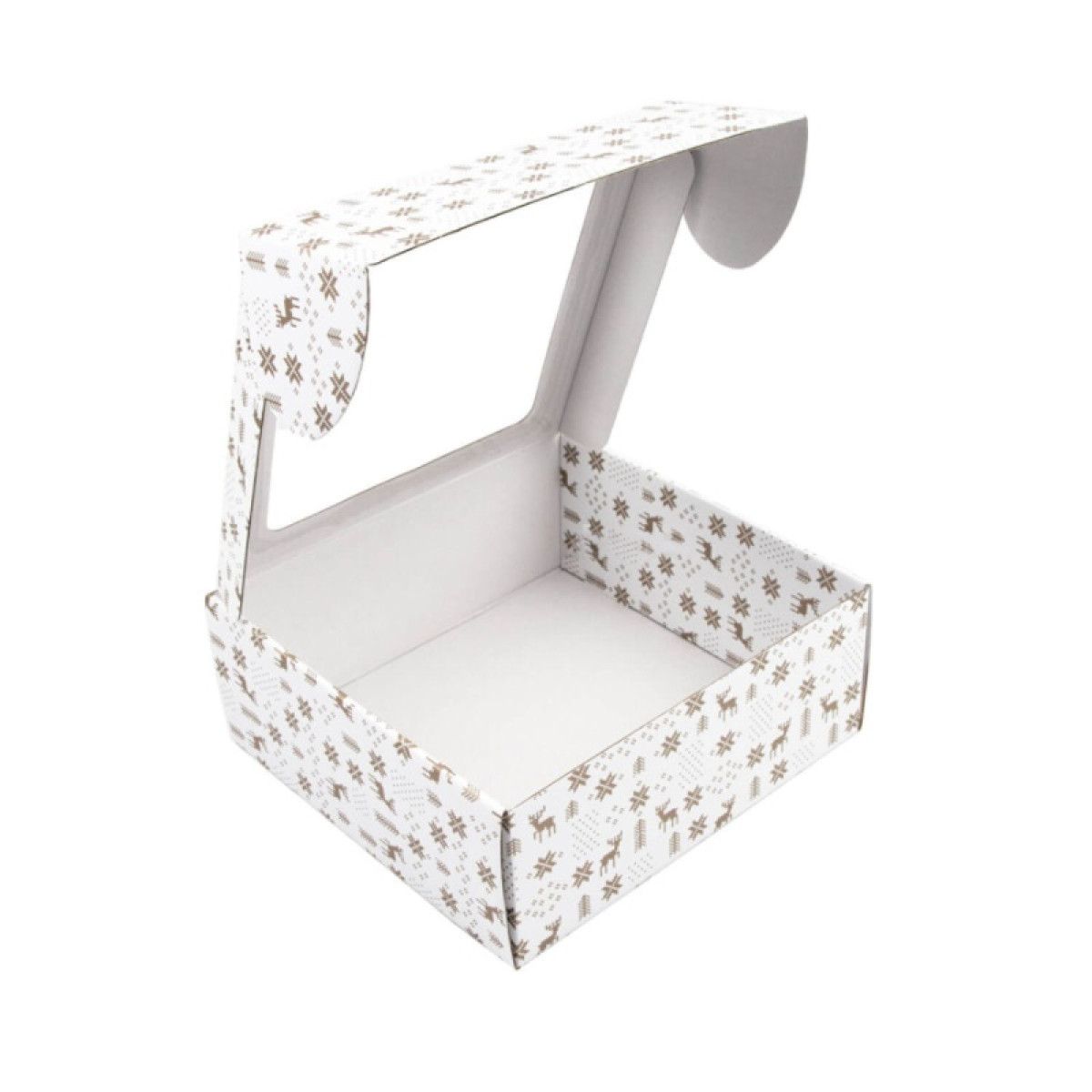 Išskirtinio dizaino dovanų dėžutė su kalėdiniais motyvais idealiai tiks dovanoms supakuoti! Su skaidriu langeliu ir auksiniu briedžiukų ir snaigių raštu.