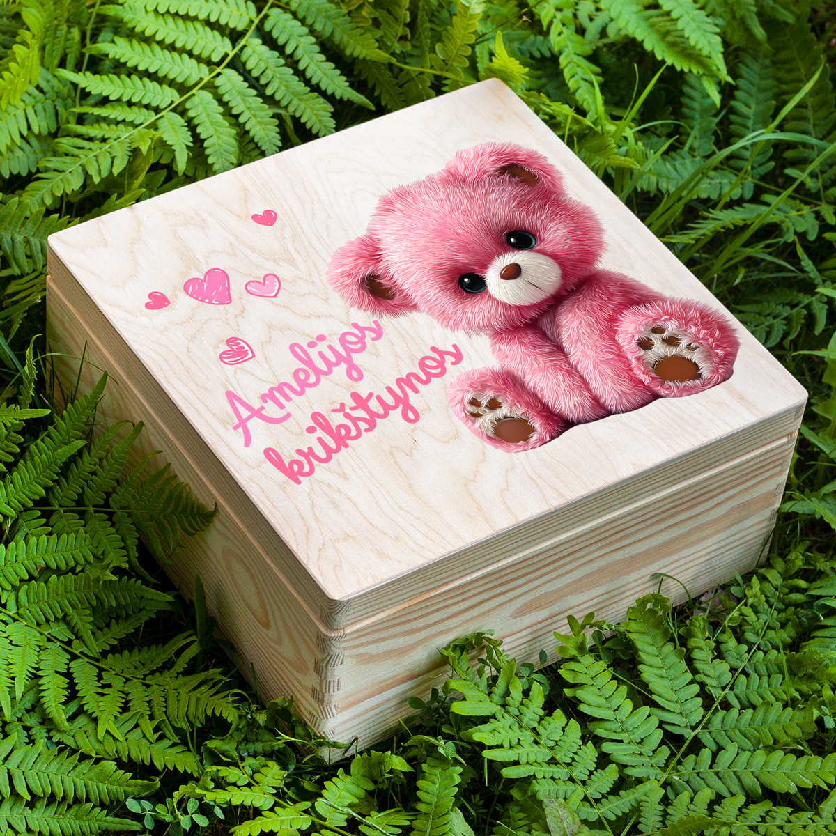 Medinė dėžė "Meškutės krikštynos" su pasirinktu vardu (30x30cm)