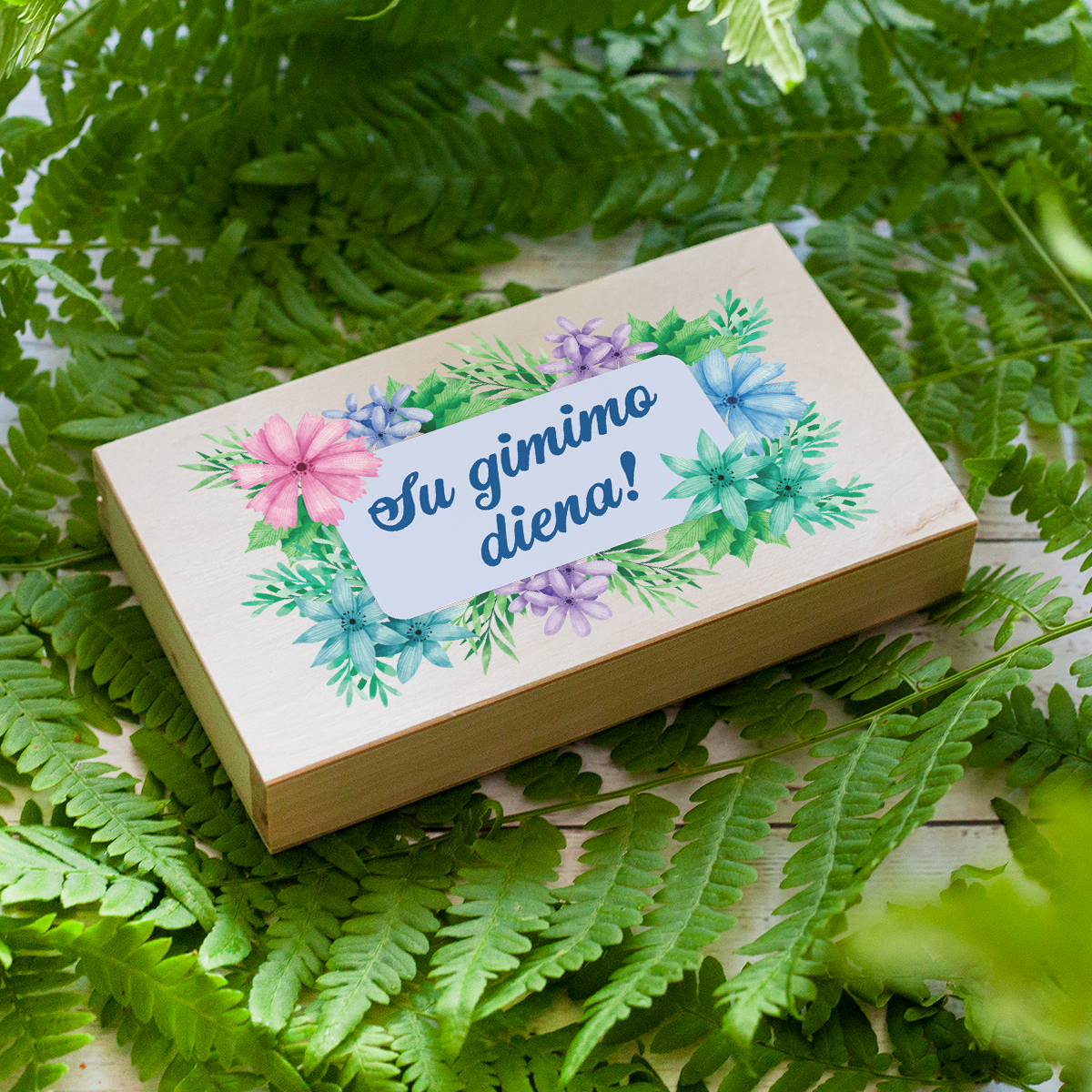 Medinė pinigų dėžutė su užrašu "Gimtadienis". Šioje dėžutėje originaliai supakuosite piniginę dovaną ar atviruką su sveikinimais.