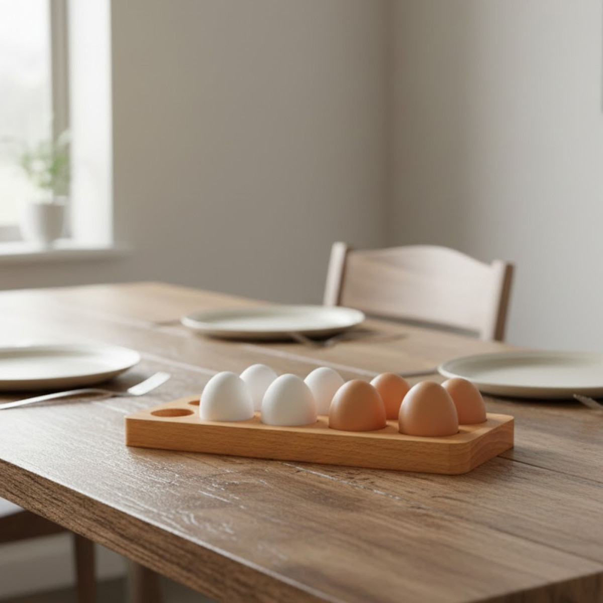 Tvarkingas ir praktiškas stovelis kiaušiniams laikyti. Pagamintas iš natūralios buko medienos, todėl yra tvirtas, ilgaamžis ir estetiškai atrodo virtuvėje. Tinka laikyti kiaušinius ant stalviršio, spintelėje ar šaldytuve.