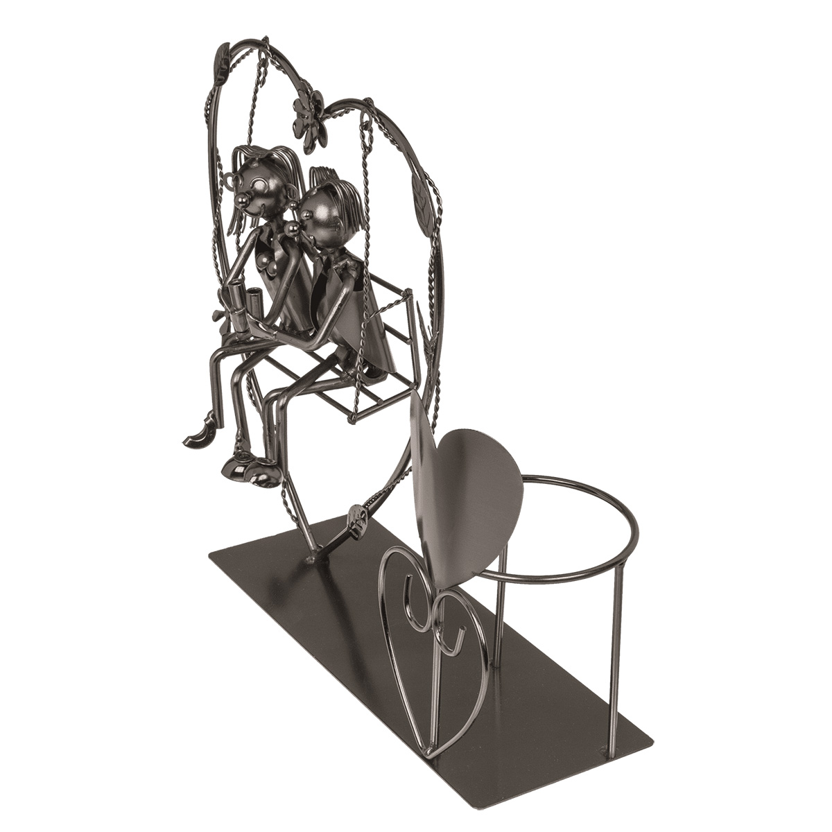 Ieškote dovanos, kuri būtų ne tik praktiška, bet ir turėtų emocinę vertę? Tuomet šis metalinis butelio laikiklis „Porelė ant sūpynių“ – tai būtent tai, ko reikia! Unikalus dizainas su įsimylėjėlių pora, besisupančia sūpynėse, suteiks jūsų namų interjerui šilumos, jaukumo ir romantikos.