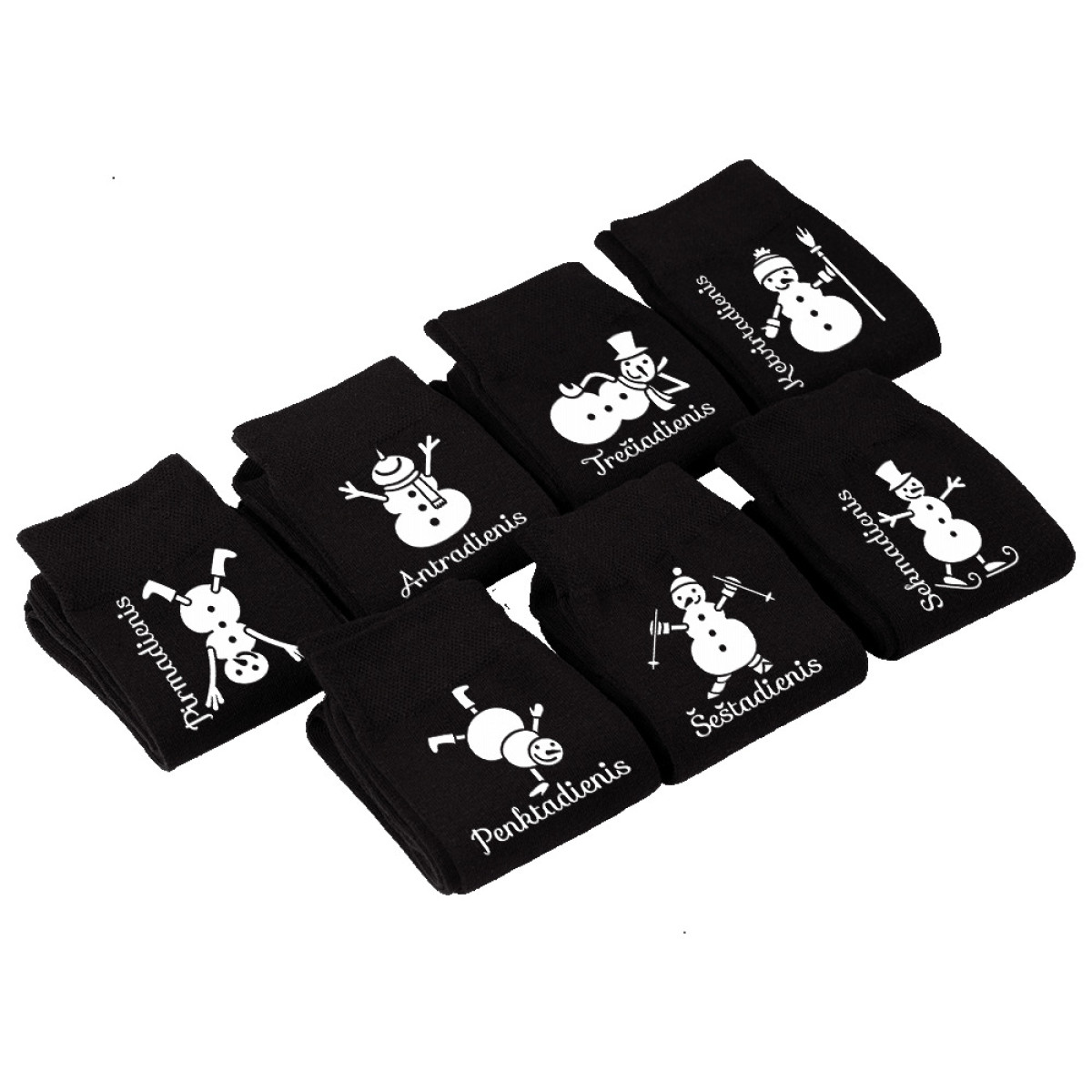 - 7 poros kojinių su spauda ant kiekvienos kojinės (7 skirtingi maketai x 2 vnt.).