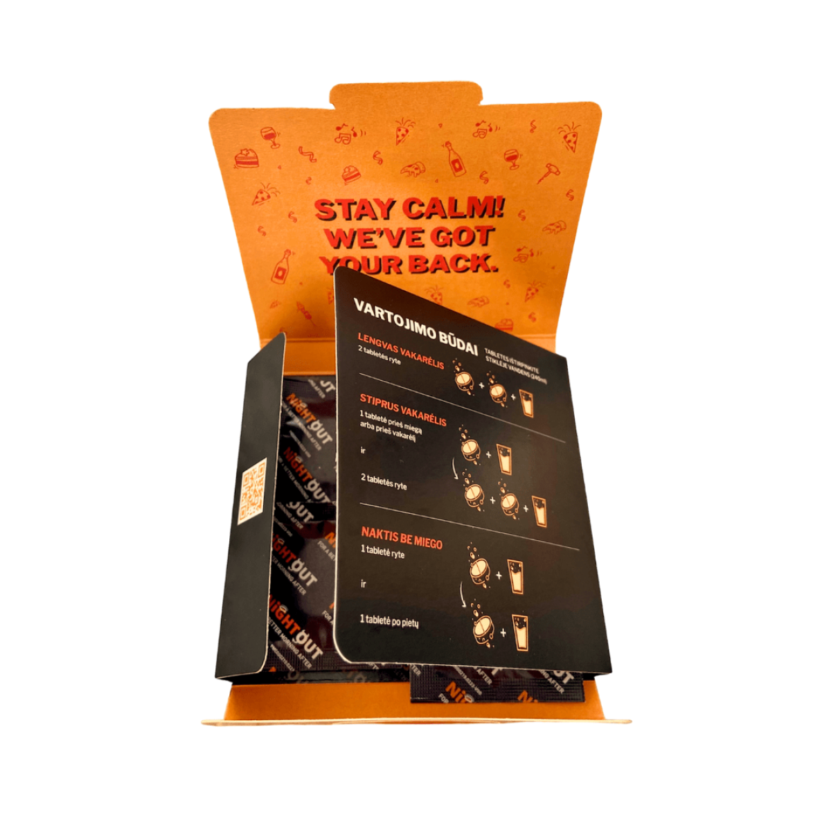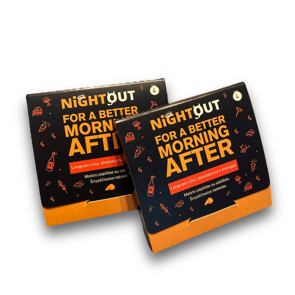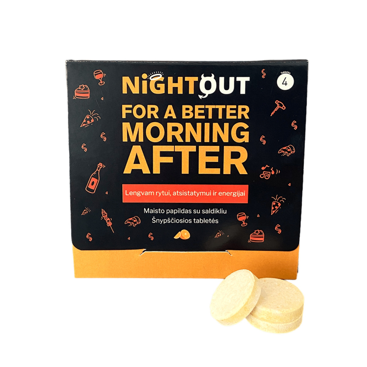 NIGHTOUT yra apelsinų skonio šnypščiosios tabletės, skirtos pagirių malšinimui. Šis papildas gerina fizinę ir protinę veiklą, apjungdamas mineralines druskas ir detoksikacijos mišinius, kurie padeda organizmui atsikratyti toksinų, kuriuos sukelia alkoholio vartojimas. Nightout suteikia natūralią energiją be stimuliatorių, pavyzdžiui, kofeino.