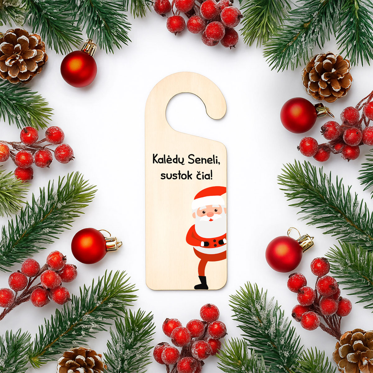 Pakabinama medinė lentelė ant durų "Kalėdų Seneli, sustok čia"