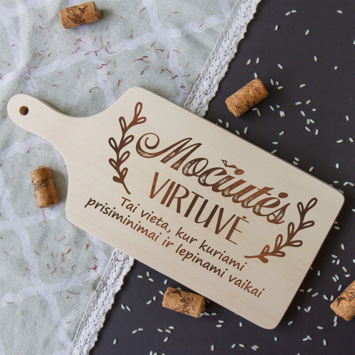 Šią medinę graviruotą pjaustymo lentelę galima naudoti ir pagal paskirtį, ir kaip namų aksesuarą. Juk pjaustymo lentelė yra, bene, labiausiai reikalingas daiktas virtuvėje.