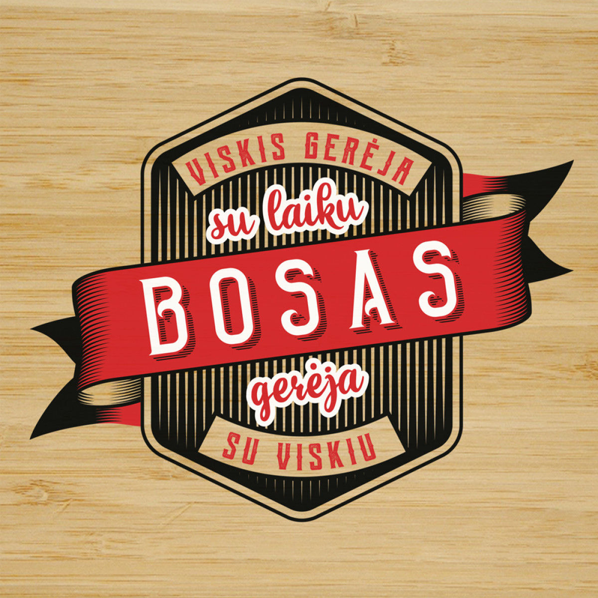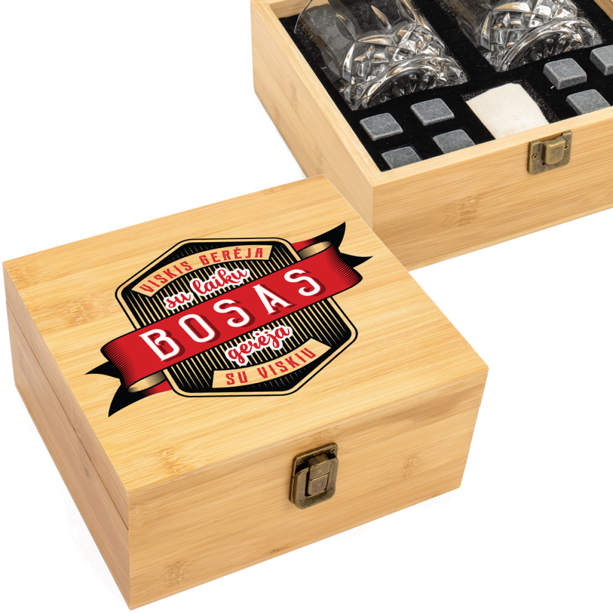 Prabangus viskio stiklinių rinkinys bambukinėje dėžutėje su užrašu "Viskis gerėja su laiku. Bosas gerėja su viskiu".