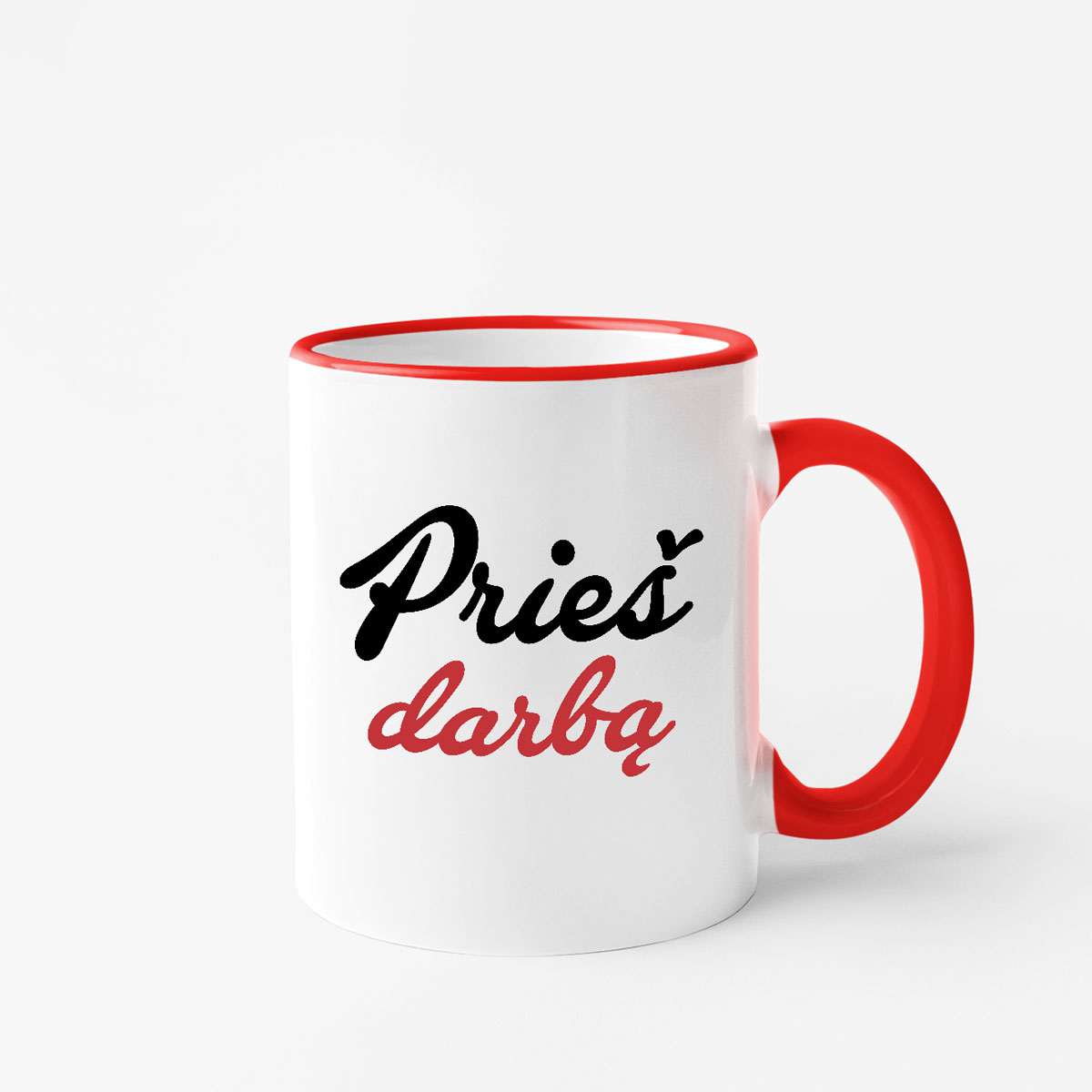 - Puodelis su spalvotu krašteliu – šis modelis išsiskiria stilingu dizainu: subtiliai spalvotu krašteliu ir ąsele, kurie suteikia puodeliui žaismingumo ir puikiai išryškina unikalų užrašą.