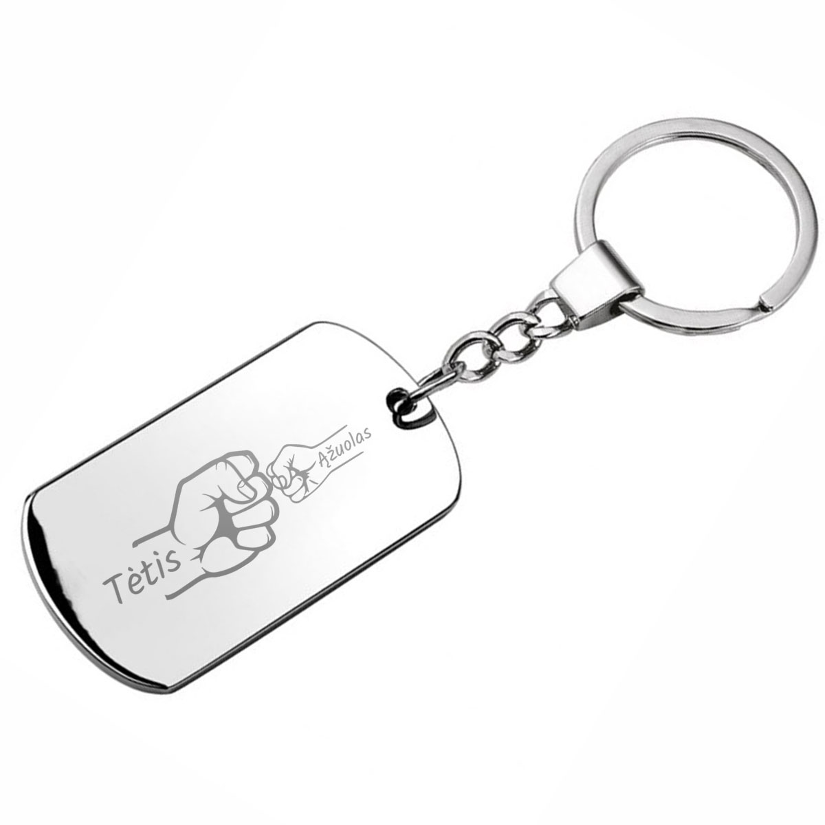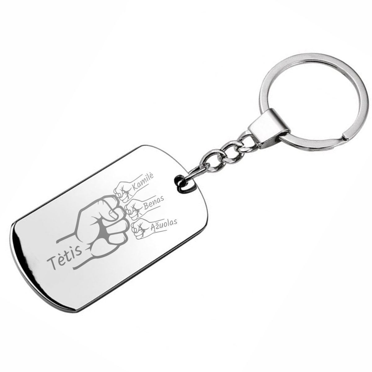 Sidabrinės spalvos raktų pakabukas "Tėčio komanda" su pasirinktais vaikų vardais - išskirtinė dovana, kuri nudžiugins kiekvieną tėtį.
