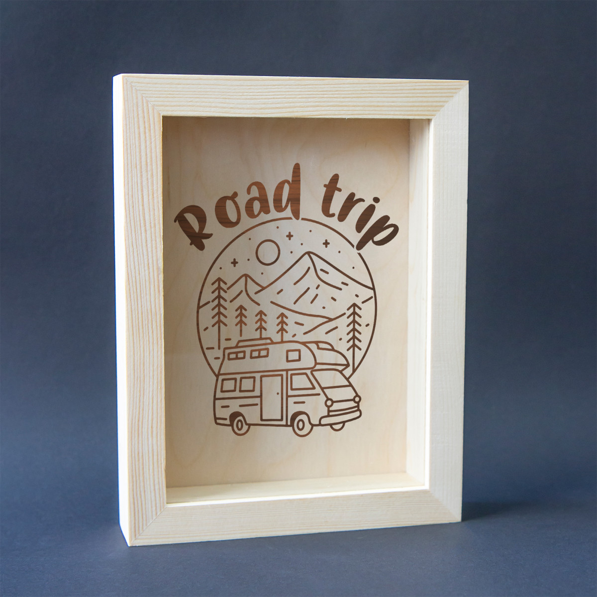 Išskirtinis rėmelis - taupyklė "Road trip" su graviruotu tekstu viduje. Tai originali taupyklė ir puiki dovana!