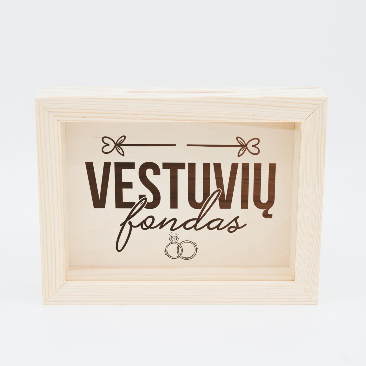 Išskirtinis rėmelis - taupyklė "Vestuvių fondas" su graviruotu tekstu viduje. Tai originali taupyklė ir puiki dovana!