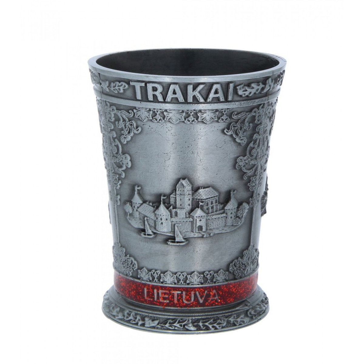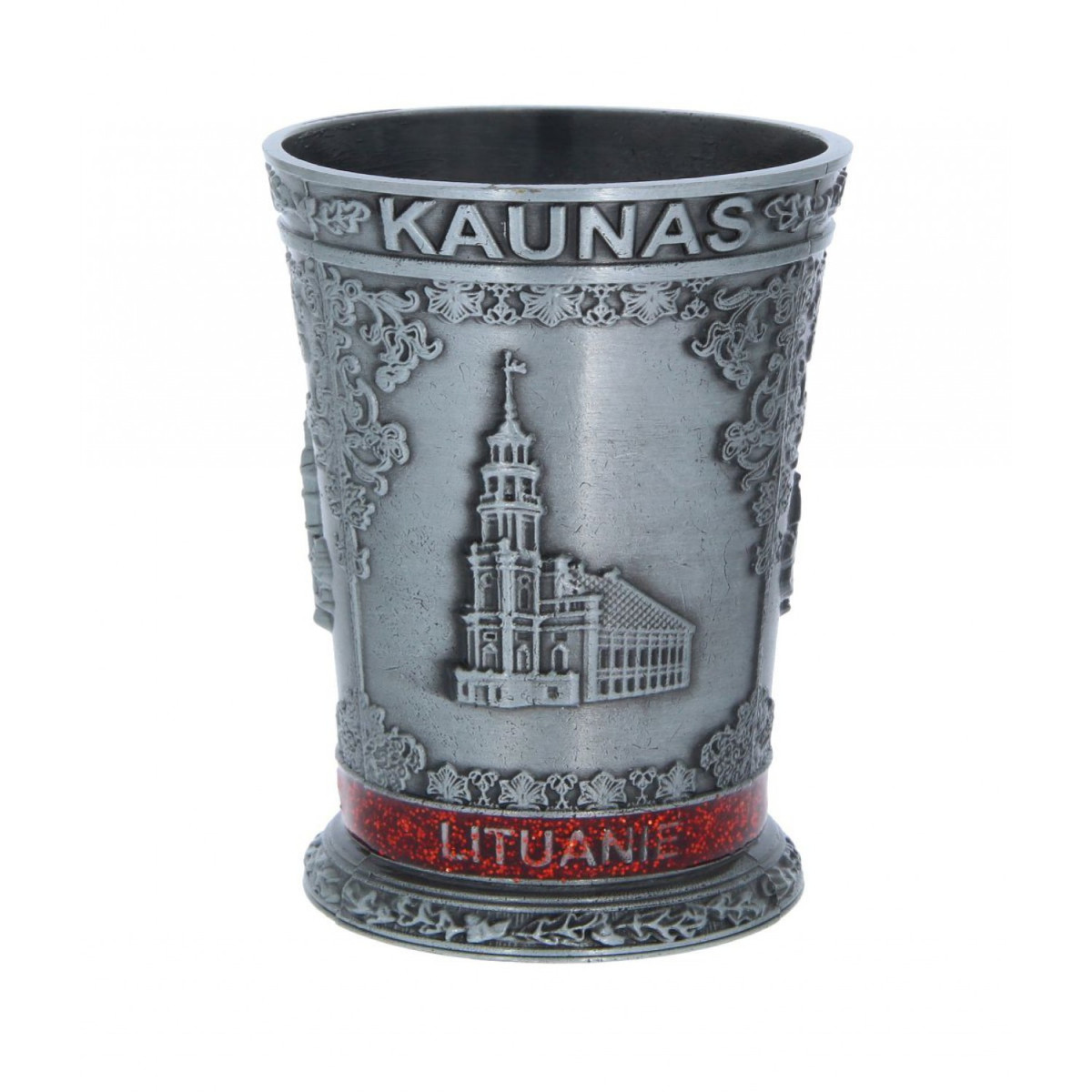 Kolekcinis sidabro spalvos metalinis stikliukas su reljefiniais Vilniaus, Kauno ir Trakų architektūros simboliais. Dekoruotas smulkiomis detalėmis. Tvirtas, ilgaamžis, pagamintas iš kokybiško metalo.