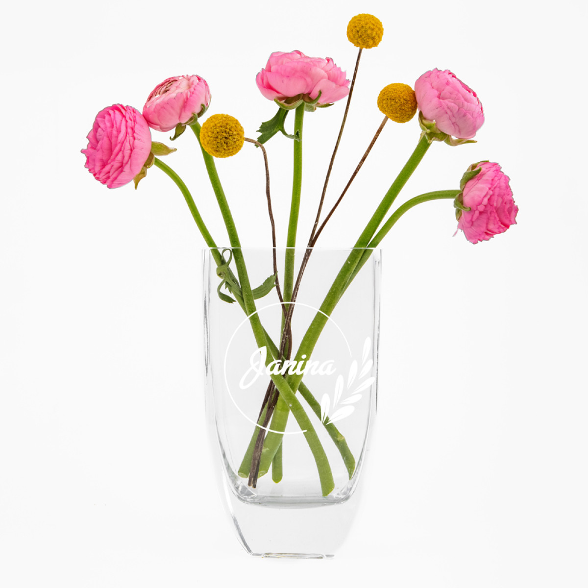 Stiklinė, lašo formos, graviruota vaza su užrašu "Janina". Puikiai tiks pasveikinti Janiną artėjančių Joninių dienos proga.