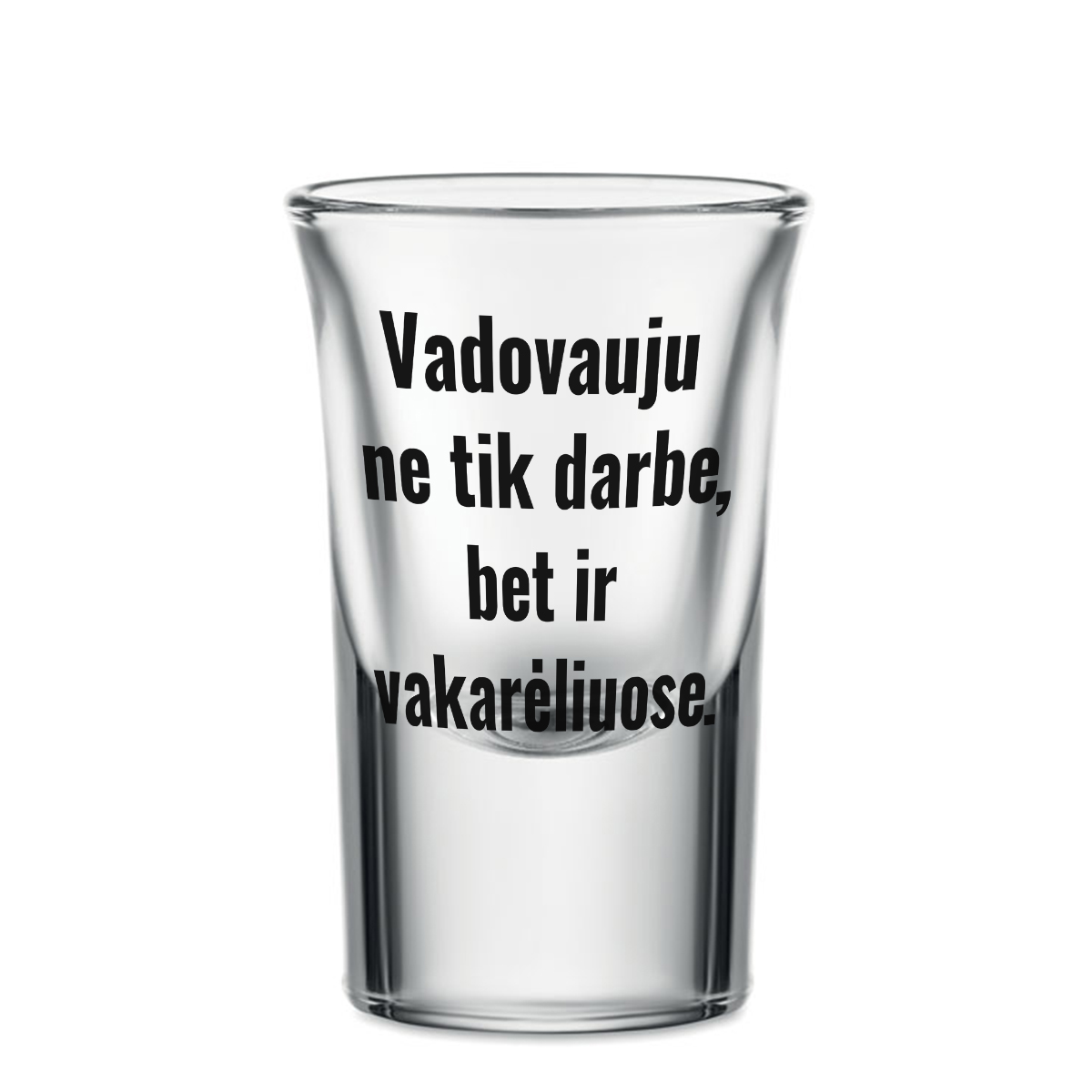 Stikliukas "Vadovauju vakarėliuose", 30 ml - su užrašu "Vadovauju ne tik darbe, bet ir vakarėliuose.".