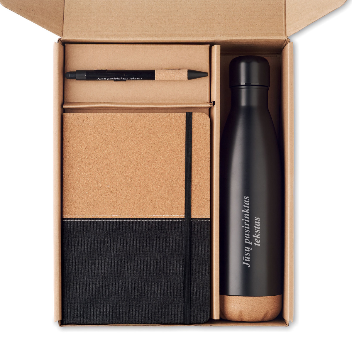 Šis rinkinys sujungia funkcionalumą ir tvarumą - puikus pasirinkimas tiems, kurie vertina aplinką, minimalistinį stilių ir kokybę. Komplekte: gertuvė, užrašų knygutė ir tušinukas - visas komplektas pateikiamas elegantiškoje dėžutėje, todėl idealiai tinka dovanai. Be to, rinkinį galima paversti asmeniška dovana: ant tušinuko ir gertuvės galima išgraviruoti norimą tekstą, pvz. vardą, inicialus ar trumpą palinkėjimą.